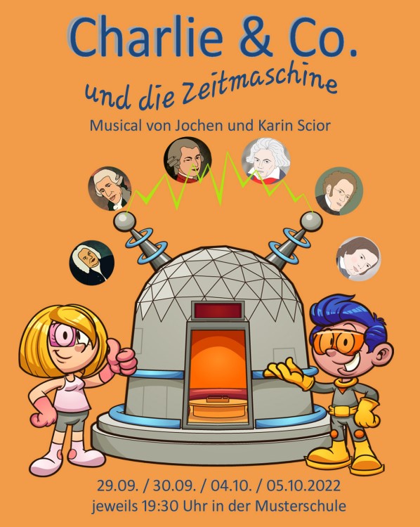 Wie wäre es, so berühmten Komponisten und Musikern wie beispielsweise Bach, Mozart, Schubert oder Schumann einmal selbst gegenüber zu stehen, sie in ihrem Umfeld zu erleben und sie selbst ihre eigenen Werke musizieren zu hören? Weil der Musikunterricht ihrer Lehrerin Frau Asbach ihnen so trocken und eintönig erscheint, lassen sich Charlie und ihre Freunde aus dem von Jochen Scior und seiner Frau Karin Scior geschriebenen Musical „Charlie & Co. und die Zeitmaschine“ mittels einer Zeitmaschine aus dem Jahr 2022 kurzweg direkt in die Komponierstuben der großen Berühmtheiten versetzen. Und was sie dort und wir in der Schulaula geboten bekommen, kann sich auf ganzer Linie sehen und hören lassen!